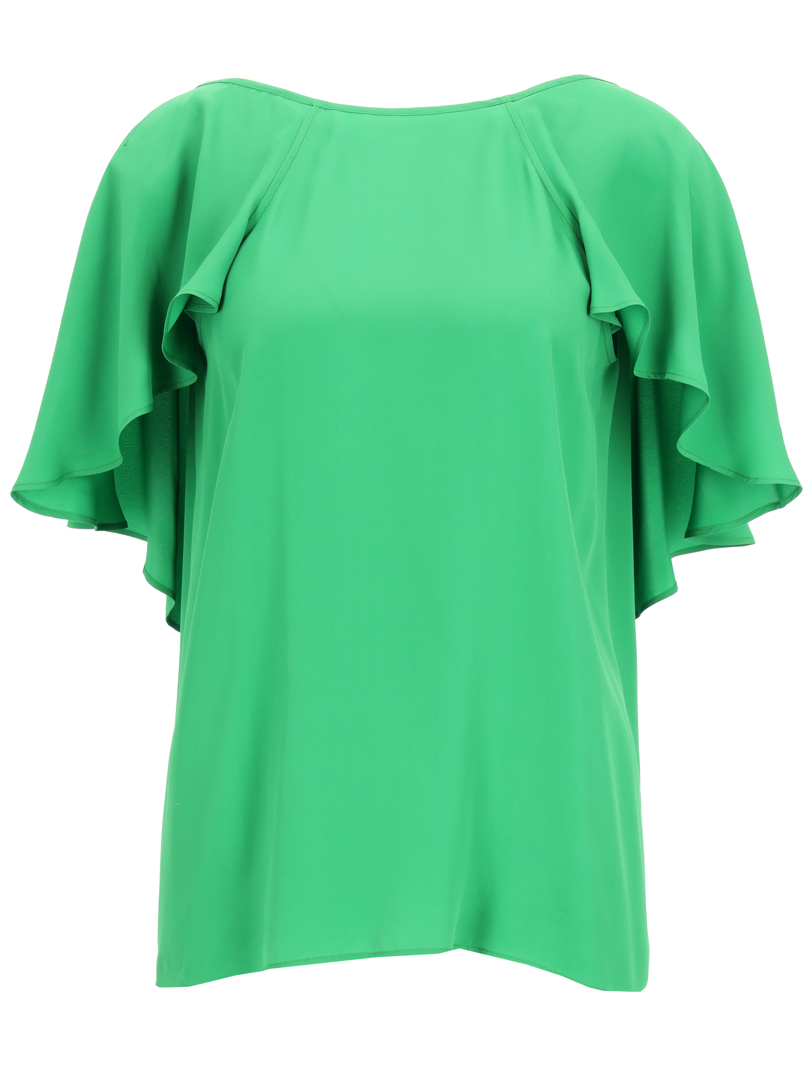 Bluse aus Crêpe de Chine aus Seidenmix mit U-Boot-Ausschnitt, rückenfrei mit gekreuzten Trägern. Gerader Schnitt mit kurzen drapierten Ärmeln in Cape-Optik, mit breitem Volant bis über die Rückseite. Dieses Kleidungsstück wird aus Materialien gefertigt, die aus Wäldern stammen, die nach den Grundsätzen der Nachhaltigkeit bewirtschaftet werden, welche auch für die gesamte Produktionskette zertifiziert wird.