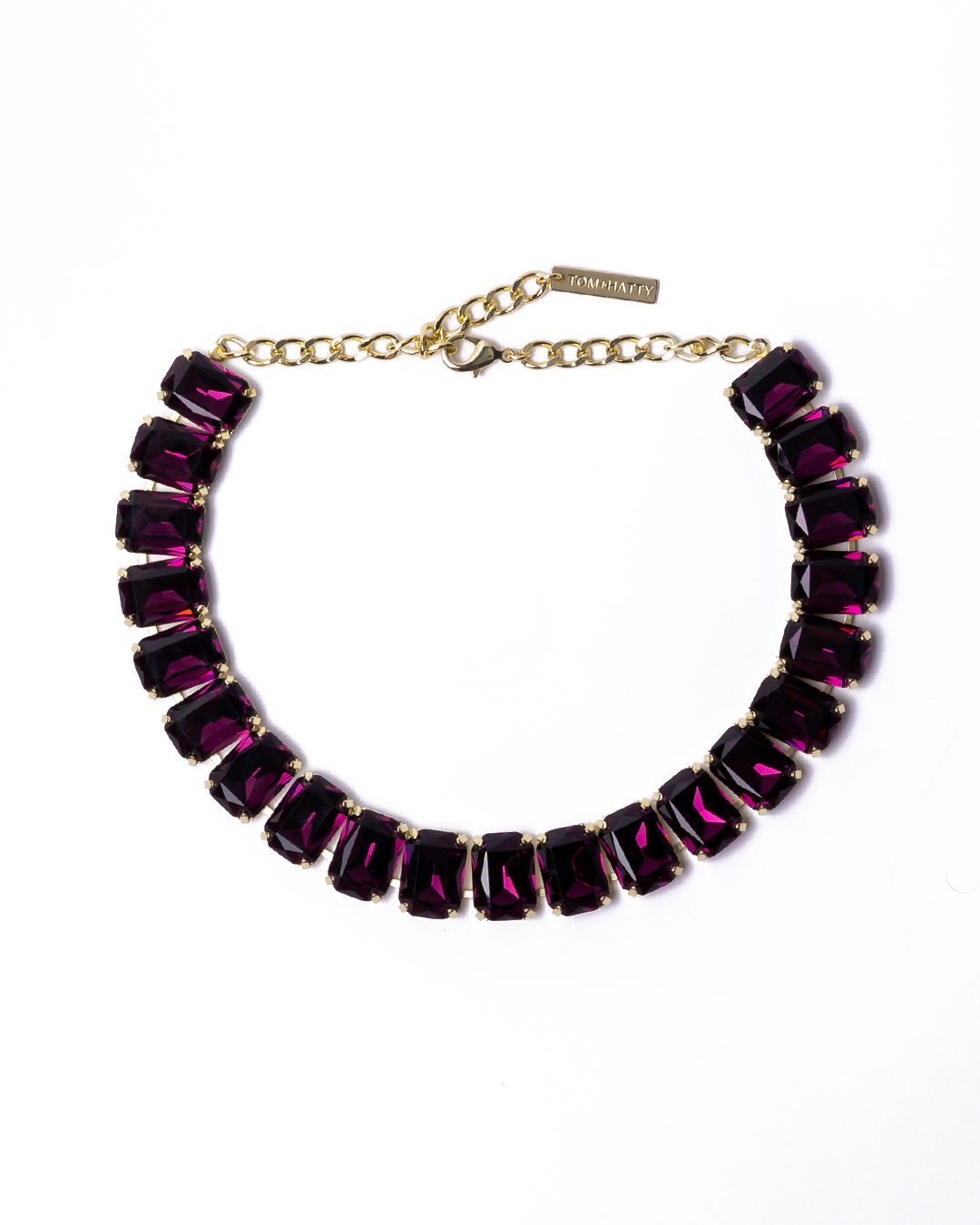 Die Halskette ist aus einer Reihe von gleichförmigen Kristallen in einer Krallenfassung und mit einem Karabinerverschluss gefertigt.
