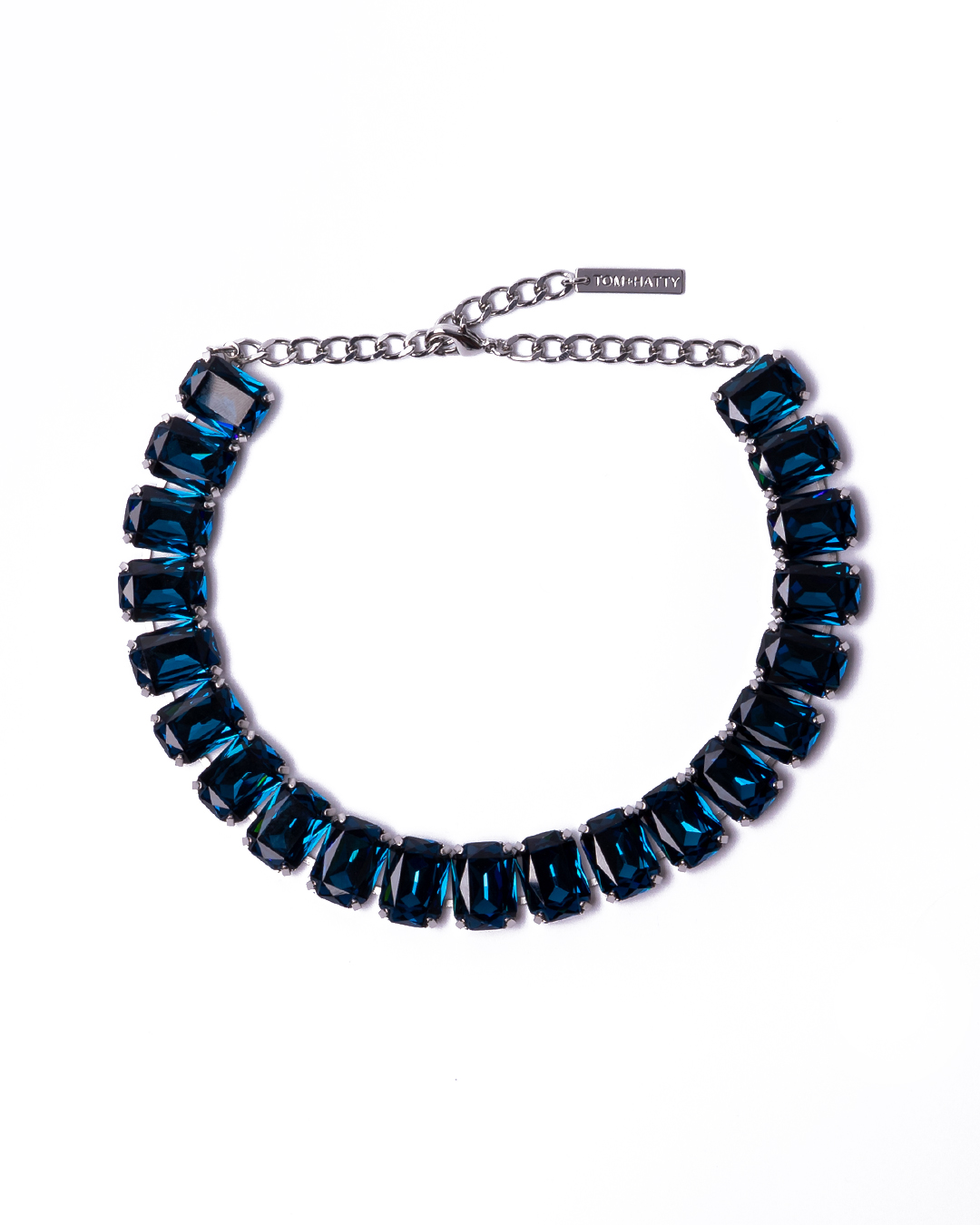 Die Halskette ist aus einer Reihe von gleichförmigen Kristallen in einer Krallenfassung und mit einem Karabinerverschluss gefertigt.