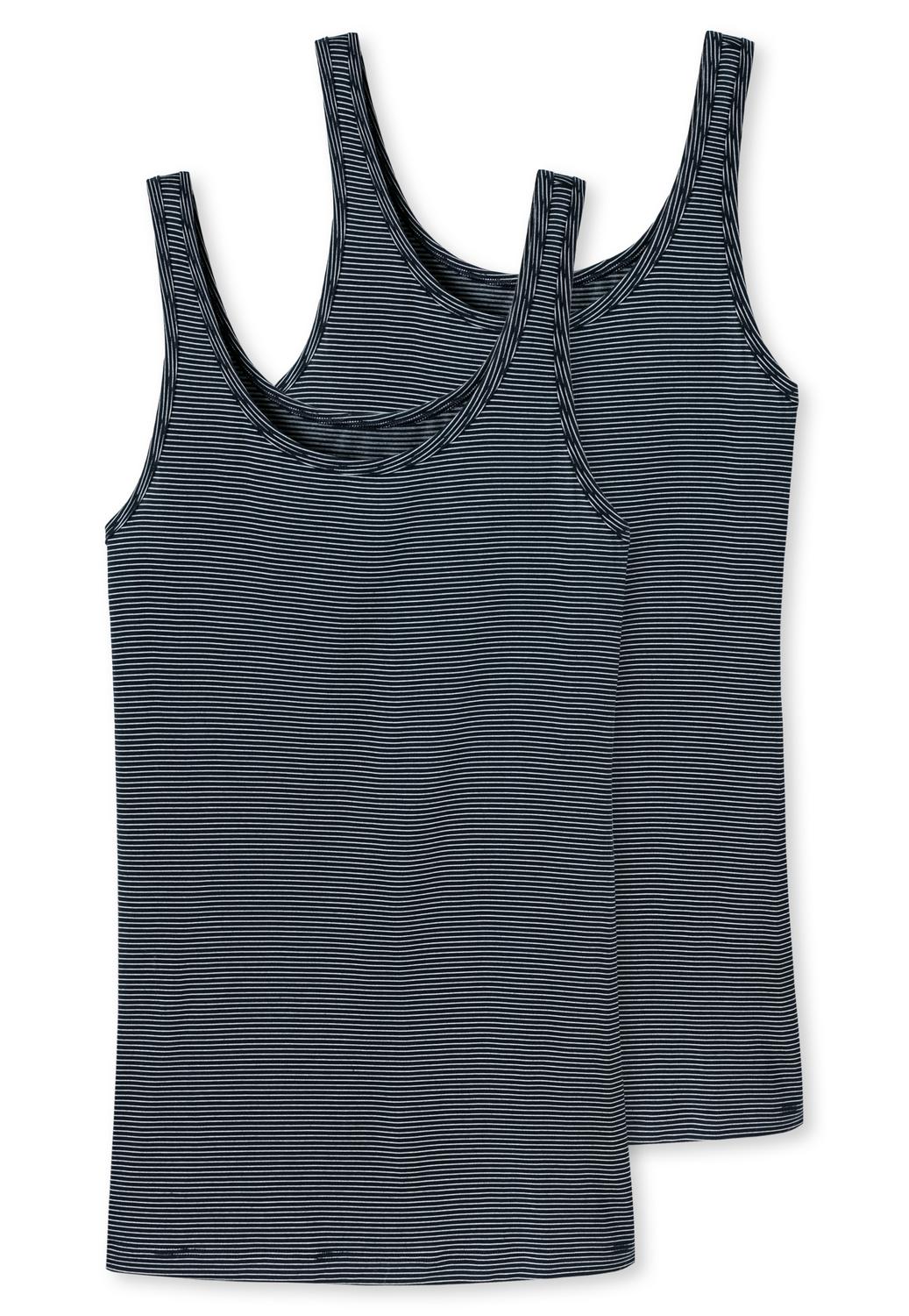 Basic-Wäsche im 2er-Pack: Bei diesen Trägertops für Damen trifft eine perfekte Passform auf wunderbar leichtes Material. Formstabiler, elastischer Single Jersey mit hohem Modal-Anteil ist dabei das Komfortgeheimnis der beiden Tops, die sich nicht nur herrlich soft anfühlen, sondern zudem noch temperaturausgleichend sind. Mit ihren nachtblau-weißen, schmal gestrickten Ringeln werden die Unterhemden zum charmanten Basic-Duo - natürlich in bester SCHIESSER-Qualität!